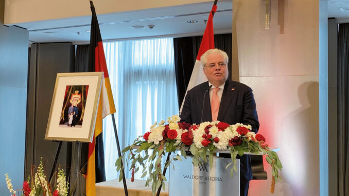 Die Botschafterin des Großherzogtums Luxemburg, Sylvie Lucas (am Rednerpult), empfing ihre Gäste zum Nationalfeiertag des Landes in ihrer Botschaft in der Klingelhöferstraße. Gefeiert wurde der Geburtstag von Großherzog Henri (Jahrgang 1955), des luxemburgischen Staatsoberhaupts. Der Großherzog begehe in diesem Jahr sein 25. Thronjubiläum, erklärte die Missionschefin in ihrem Grußwort. Im Oktober werde er zugunsten seines ältesten Sohns Guillaume abdanken. Großherzog Henri seien die Beziehungen zu Deutschland immer ein Herzensanliegen gewesen, unterstrich die Botschafterin.