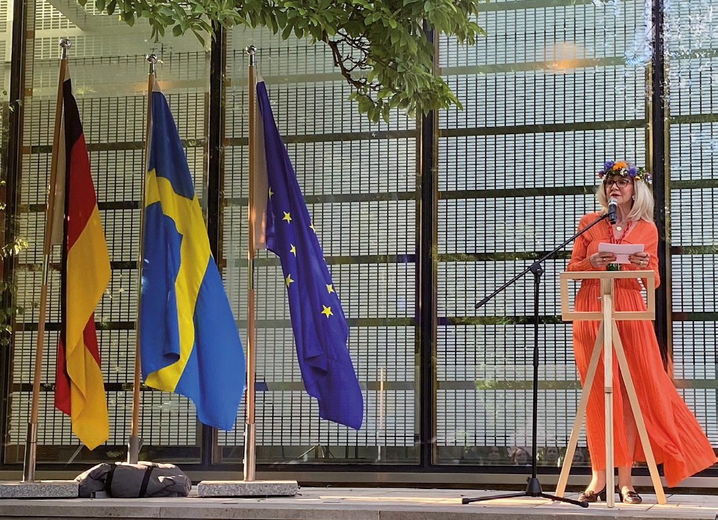 Schwedens Botschafterin Veronika Wand-Danielsson (Foto) bat ihre Gäste in den festlich geschmückten Garten ihrer Residenz in Dahlem, um den Nationalfeiertag des Landes zu begehen. Der sommerliche Feiertag gehe zurück auf die Krönung von König Gustav Wasa am 6. Juni 1523, mit der Schweden die Union mit Dänemark beendete und ein unabhängiger Staat wurde, erklärte die Missionschefin in ihrer Grußansprache. Schweden entwickle sich erfolgreich, es gehöre seit 30 Jahren der Europäischen Union und seit einem Jahr auch der NATO an. Nach der Rede wurden die Nationalhymnen Schwedens („DU GAMLA, DU FRIA“) und Deutschlands gesungen und die Botschafterin lud ihre Gäste zum Tanz um den Mittsommerbaum ein.