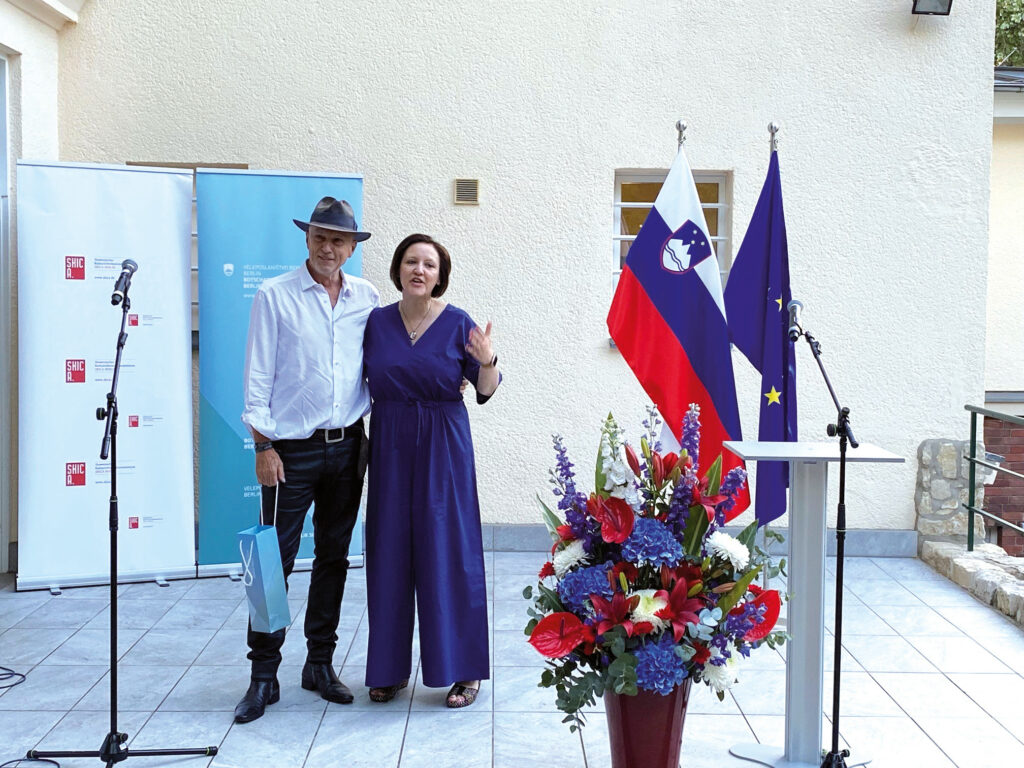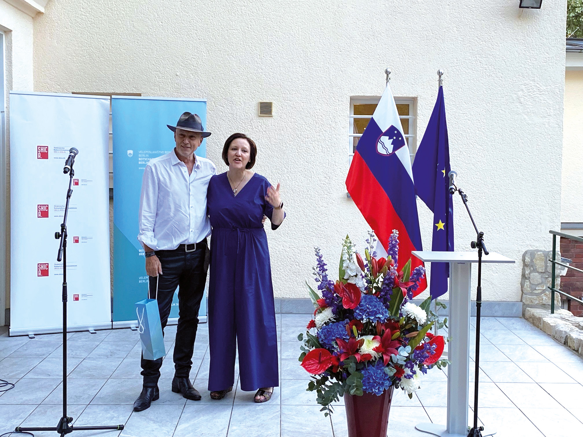 Dr. Ana Polak Petrič, Sloweniens Botschafterin, lud in den Garten ihrer Dahlemer Residenz ein, um bei schönstem Sommerwetter den Unabhängigkeitstag ihres Landes zu feiern. Zwar sei die Republik Slowenien erst 34 Jahre alt, doch das Land könne auf eine lange und reiche Geschichte zurückschauen, sagte die Botschafterin in ihrer Grußansprache. Kulinarisch und kulturell präsentierte sich den Gästen die nach dem Fluss Mur benannte Region Prekmurje im äußersten Nordosten Sloweniens. Musikalischer Höhepunkt des Sommerabends war ein mitreißendes Konzert des Rock- und Folkmusikers Vlado Kreslin (Foto mit der Botschafterin), der die Gäste mit seiner schwarzen Gitarre begeisterte.
