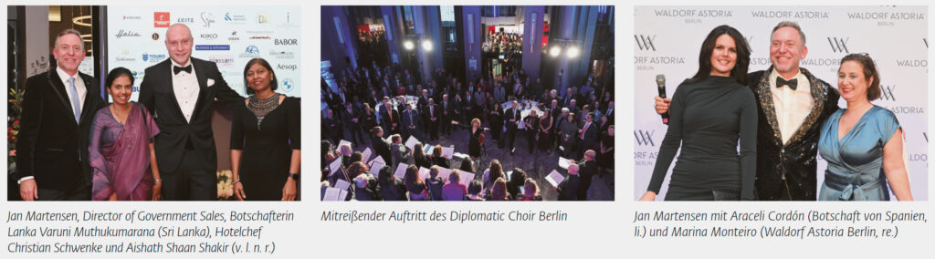 Hausherr Christian Schwenke hieß die Gäste aus Diplomatie, Politik, Wirtschaft und Medien im 5-Sterne-Hotel am Zoo herzlich willkommen und wünschte allen ein gesundes neues Jahr. Er hoffe auf die Fortsetzung der „wunderbaren Partnerschaft“ mit den Botschaften auch in diesem Jahr, so der Direktor. Jan Martensen stellte die hochkarätigen Sponsoren des Abends vor, darunter BMW, Sixt, Airbus, KaDeWe, Geldermann, Hannover-Messe, Touro University und die Königliche Porzellan-Manufaktur (KPM). Die Gäste wurden mit Geldermann Crémant Baden Brut und kulinarischen Köstlichkeiten verwöhnt und konnten mit etwas Glück hochwertige Tombola-Preise gewinnen. Für musikalischen Genuss sorgte der mitreißende Auftritt des Diplomatic Choir Berlin unter Leitung von Barbara Leifer.