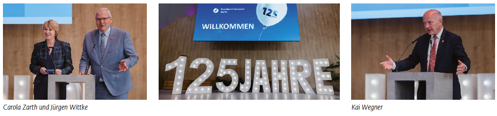 Die Präsidentin der Handwerkskammer Berlin, Carola Zarth, begrüßte zahlreiche prominente Gäste – darunter hochrangige Vertreter*innen aus Politik, Wirtschaft und Gesellschaft. Neben dem Regierenden Bürgermeister nahmen u. a. die Senatorinnen Cansel Kiziltepe und Katharina Günther-Wünsch, die Senatoren Christian Gaebler und Stefan Evers, der SPD-Fraktionsvorsitzende Raed Saleh, der CDU-Fraktionsvorsitzende Dirk Stettner, der Präsident der IHK Berlin, Sebastian Stietzel, sowie Rabbiner Yehuda Teichtal an der Veranstaltung teil. Durch den festlichen Abend, dessen Höhepunkt u. a. die Ehrung traditionsreicher Handwerksbetriebe mit über 125-jähriger Geschichte waren, moderierte Dachdeckermeister und Speaker Oliver M. Oettgen. Carola Zarth sagte zu Beginn: „Mit unseren Betrieben, die das Rückgrat des Berliner Handwerks sind, blickt die Handwerkskammer auf eine Geschichte voller Wandel, Engagement und Innovation zurück – und mit Zuversicht in die Zukunft. Das Handwerk steht nie still. Es lebt von Menschen, die ihre Traditionen bewahren und zugleich mutig neue Wege gehen. Sie erschaffen das, was morgen gebraucht wird – mit Hand, Herz, Verstand und dem klaren Kompass: Wir können alles, was kommt.“ Anschließend übergab die Gastgeberin an Kai Wegner, der die Bedeutung der Handwerkskammer hervorhob: „125 Jahre Handwerkskammer – das ist gelebte Selbstverwaltung und Leidenschaft für das Handwerk in Berlin. Berlins Handwerksbetriebe waren und sind der Motor für die Entwicklung dieser Stadt und ein bedeutender Wirtschaftsfaktor. Nur mit einem starken Handwerk können wir neue Wohnungen bauen, die Infrastruktur in unserer Stadt erneuern und klimaneutral machen. Der Berliner Senat tut alles dafür, dass das Handwerk weiter ‚goldenen Boden‘ hat: mit der Meistergründungsprämie, dem Meisterbonus und dem Aktionsprogramm Handwerk. Berlin baut auch in Zukunft auf sein Handwerk.“