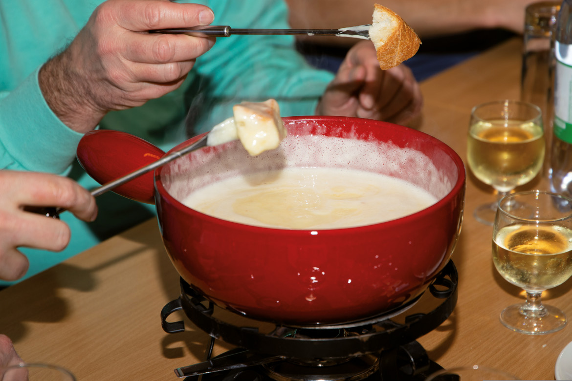 „Der Käse explodiert übrigens gerade“, sagt Matthias Kaiser und zeigt auf die vielen verschiedenen Packungen im Kühlregal. Wörtlich meint er das natürlich nicht: „Es gibt zurzeit einfach ständig neue Sorten“, erläutert er. „Wir bieten jetzt im Winter mehr als 30 Raclette-Variationen an, alle aus einer kleinen Käserei in der Nähe von Bern, damit auch kleine Betriebe und ihre Kultur erhalten bleiben.“ Die Qualität ist dabei entscheidend: „Supermarkt-Fertigfonduemischungen für ein paar Euros, das grenzt für mich an Körperverletzung“, betont Christian Kaiser. „Unsere Auswahl an frischen Fondues kommt ohne Formfette, Schmelzsalze, Aromen und Konservierungsstoffe aus.“ Die Lieblingskäsekombi der meisten Eidgenoss*innen sei hier „Moitié-Moitié“, halb und halb also – mit je gleichen Anteilen Gruyère- und Vacherin-Käse. Dazu wird Weißbrot gereicht. Fertig. Ähnlich bodenständig auch das Original-Raclette, das regional etwas unterschiedliche Ausprägungen hat. Während es in der Romandie, der Westschweiz, durchaus Tomaten beinhalten darf, setzt Christian Kaiser auf die ganz puristische Variante: „In meiner Heimat gibt’s das nur mit Kartoffeln; Silberzwiebeln und Cornichons dazu wären sozusagen schon das höchste der Gefühle.“