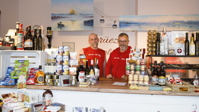 Den Unternehmensnamen haben sich die beiden Inhaber eigens als Marke eintragen lassen: „Zuhause wäre das undenkbar gewesen, weil es dort ein ganz normales Wort ist“, erklärt Eidgenosse Christian Kaiser, der aus Solothurn stammt, „aber in Deutschland war es kein Problem.“ Gemeinsam mit seinem Partner hatte er das Projekt 2012 aus der Taufe gehoben, zunächst im Güntzelkiez. Im Februar 2024 zog das „Chuchichäschtli“ an seinen heutigen Standort an der Ahrweilerstraße. Die Kaisers beteiligen sich tatkräftig an Kiezfesten, dann sind sie oft mit einem Raclette-Stand anzutreffen. Beide finden es wichtig, sich sozial zu engagieren. Bleibt etwas im Laden übrig, freut sich ein lokales Kinderheim darüber. Die Abwicklung ihres Online-Shops haben die beiden Unternehmer in die Hände des Vereins gegeben, der sich für Inklusion starkmacht. Hierher gelangt alle Ware, die die Kaisers frisch importieren. Ihre Produktpalette umfasst nicht nur bekannte Marken wie Ovomaltine, Toblerone, Rivella und Thomy oder typische Produkte wie Taschenmesser oder hochklassige Spirituosen, sondern auch Fleischspezialitäten, Chips oder gar Knäckebrot. Die deutsche Kundschaft kauft neugierig, die Berliner Exil-Schweizer*innen freuen sich über Gewohntes.